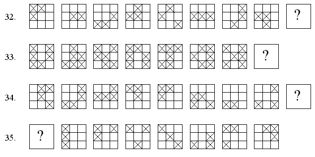 For each of the following sequences of square patterns, determine the principle that underlies the organization of the sequence and draw the pattern that would appropriately fill in the square with the question mark in it.