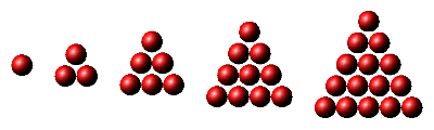 | 18. | Suppose a tetrahedral-shaped crystal is formed, like a giant pile of apples or oranges at a greengrocer's store, consisting of one atom on the top layer, three on the next-to-top layer, six on the third layer, ten on the fourth layer, and so forth as illustrated below. If there are exactly 1,000,000 layers, specify the total number of atoms in the entire crystal. Give an exact answer, not an approximate one or a formula for making the calculation. | |