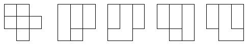 | 45. | The five figures shown below represent the appearance of a solid, opaque object as seen from five of its six sides. Each line shown depicts a side of the object that is perpendicular to the plane of this page. The object was constructed by gluing together a number of identical cubes so that at least one face of each added cube precisely and entirely covers and is everywhere contiguous with one face of a previous cube. Draw the sixth view of the object. | |